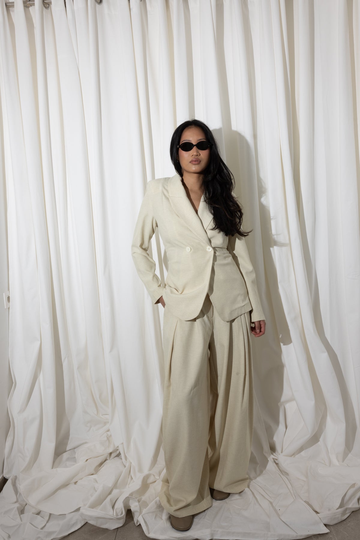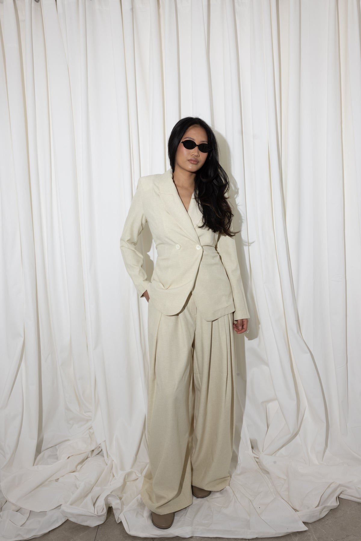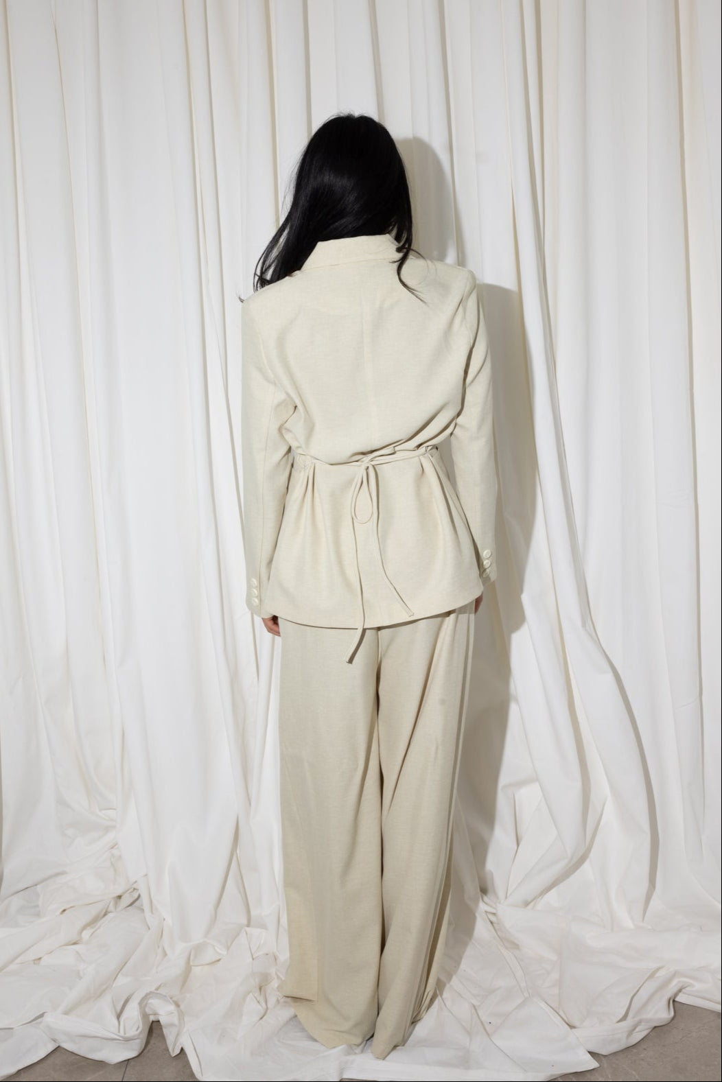 The Alba Suit is a modern two-piece set crafted in a soft sand tone with minimal detailing and a relaxed, structured fit. The double breasted blazer features clean lapels, a subtle shoulder line and an optional tie at the back for adjustable shape. The matching trousers have a high waist, soft pleats and wide legs designed to move with ease and confidence.