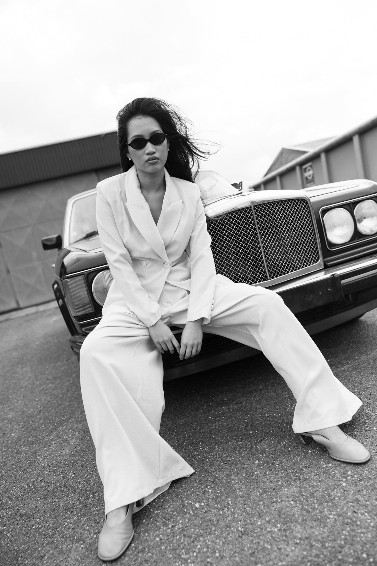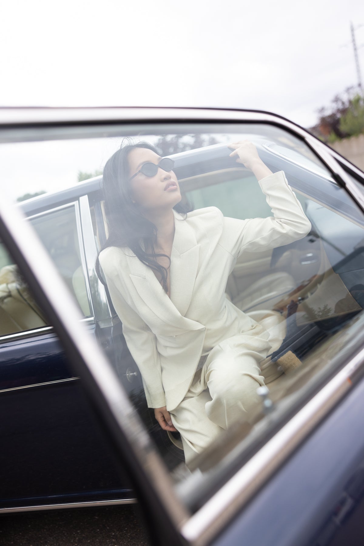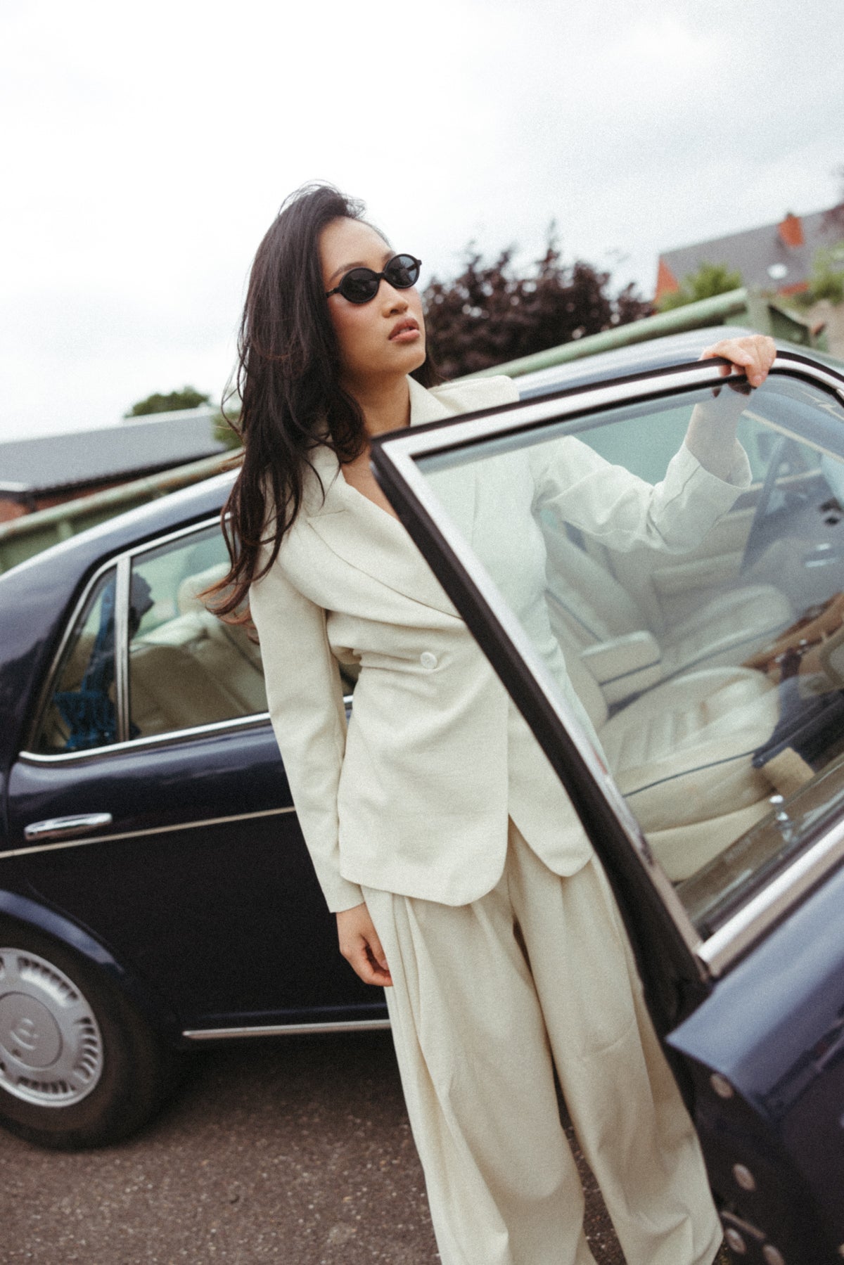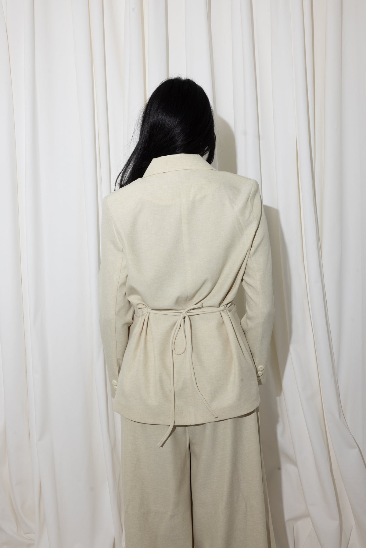 The Alba Suit is a modern two-piece set crafted in a soft sand tone with minimal detailing and a relaxed, structured fit. The double breasted blazer features clean lapels, a subtle shoulder line and an optional tie at the back for adjustable shape. The matching trousers have a high waist, soft pleats and wide legs designed to move with ease and confidence.