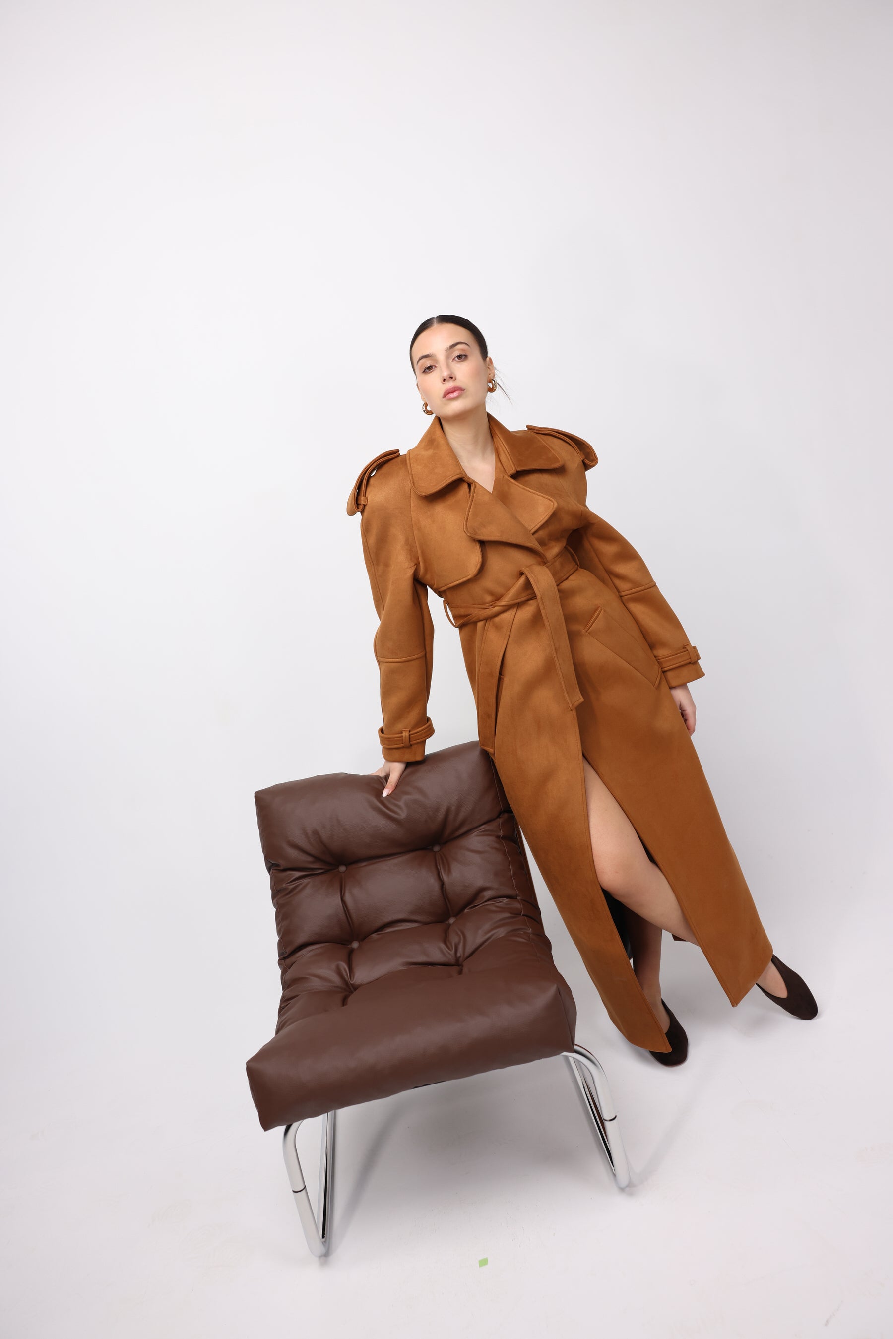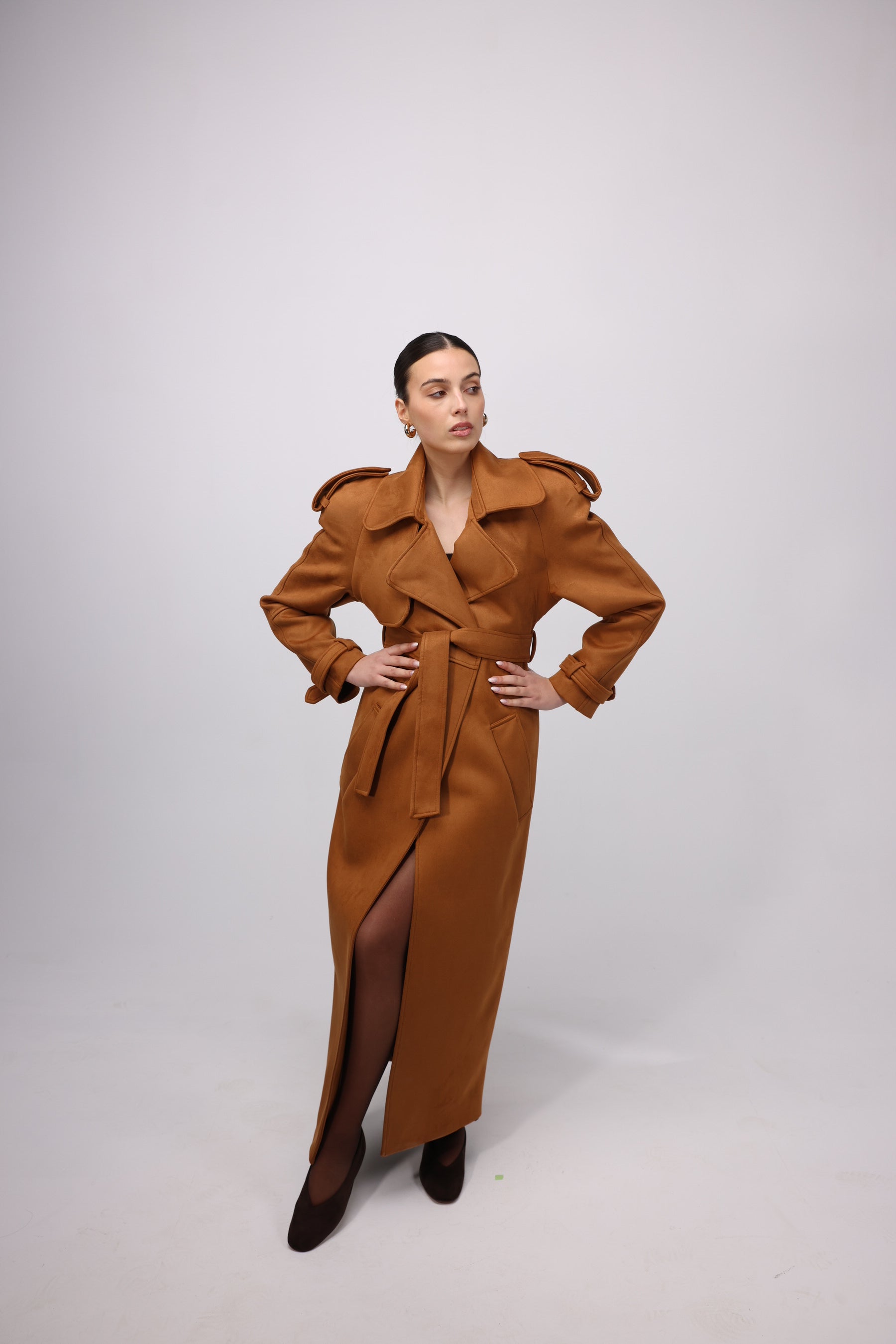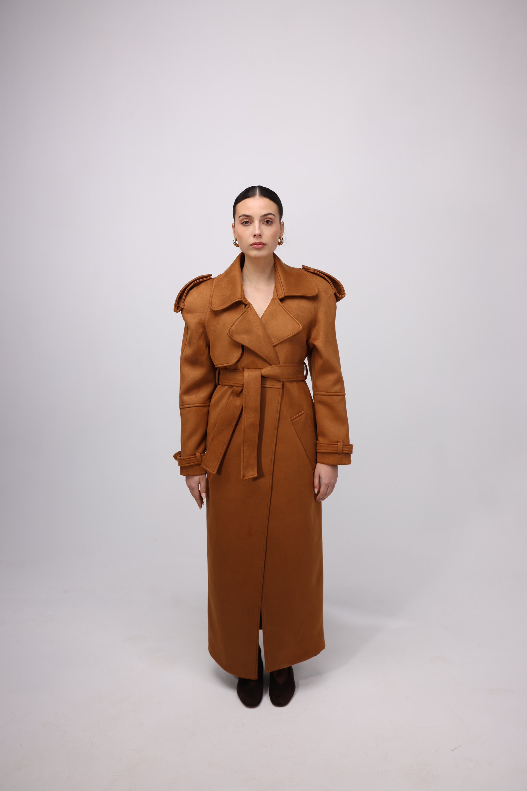 Long Camel trench coat with a belted waist, wide lapels, and structured shoulder details. A timeless, statement piece with a bold, tailored silhouette.