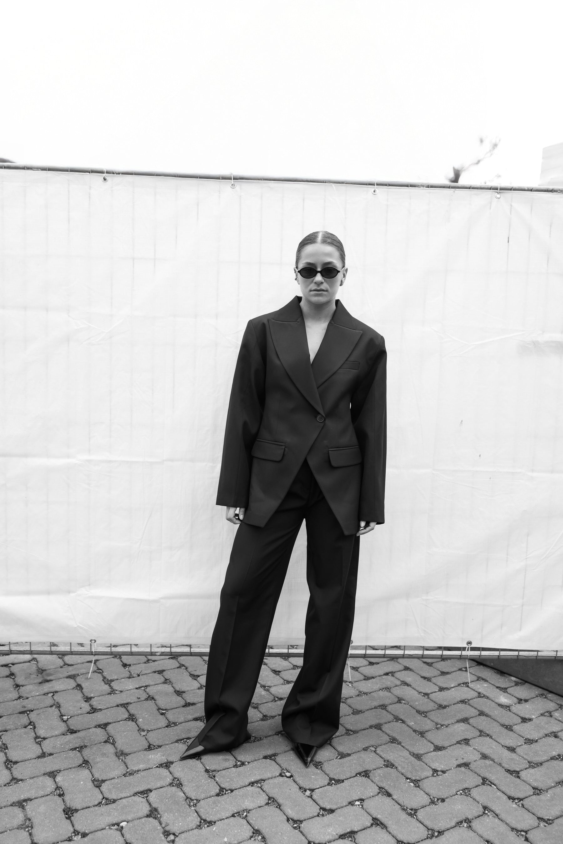Black oversized pantsuit featuring a structured blazer with wide lapels, a single-button closure, and flap pockets. Paired with wide-leg trousers for a sleek, modern silhouette.