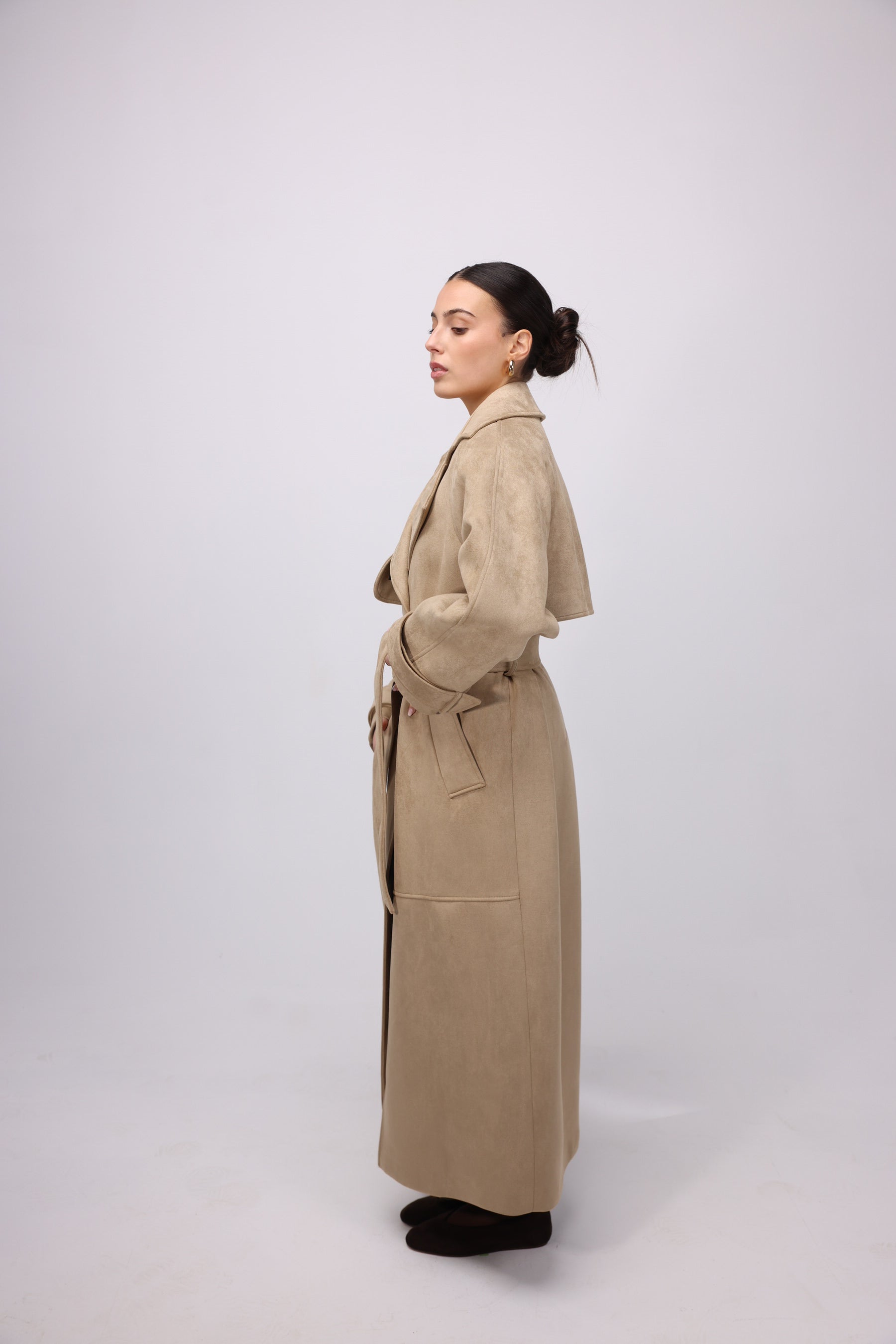 Long beige trench coat with a belted waist, oversized lapels, and cuffed sleeves. A classic, versatile piece with a relaxed yet structured fit.