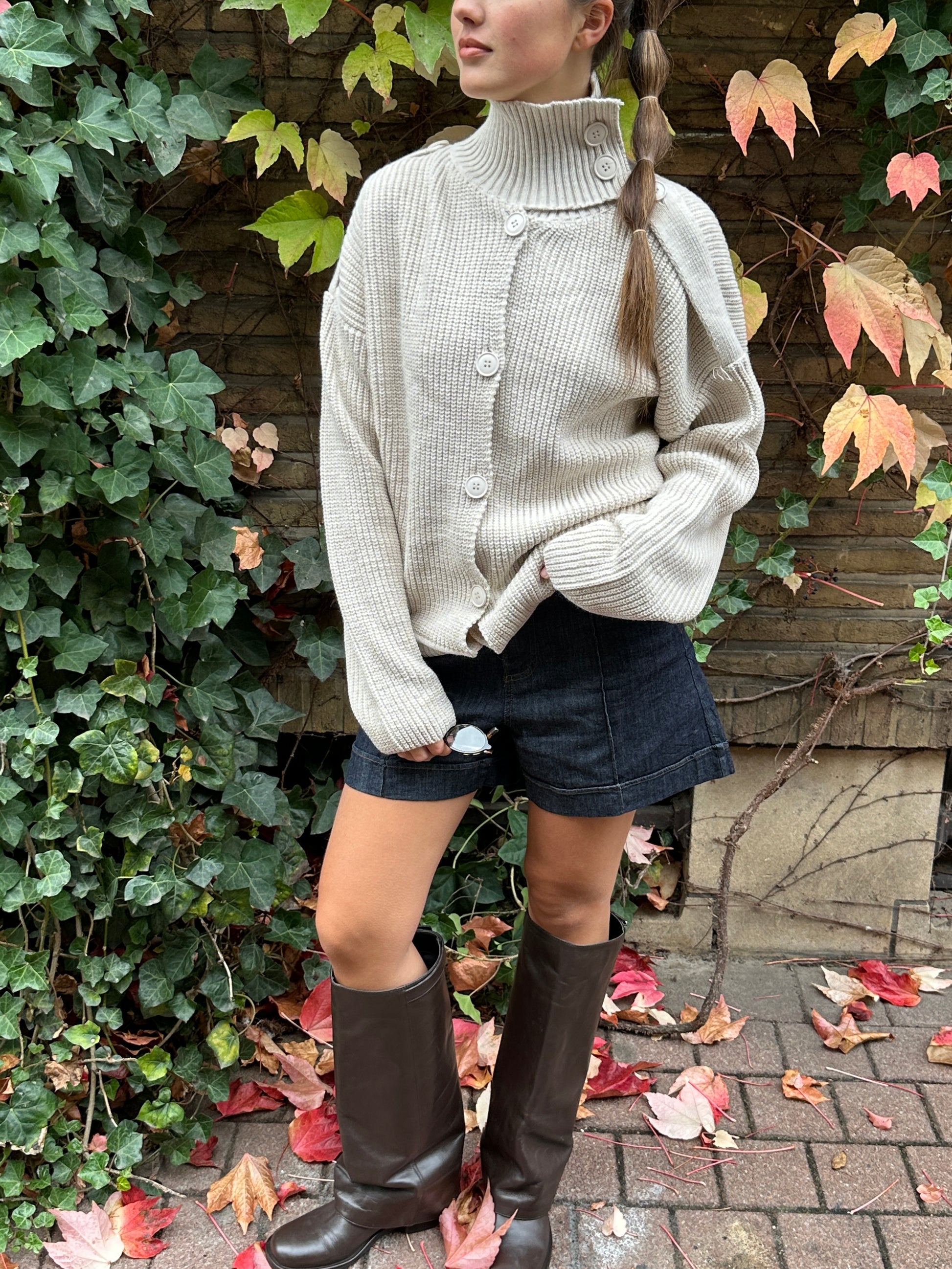 This cardigan features a high buttoned neckline and soft ribbed texture, giving it a modern yet effortless look. The slightly oversized silhouette drapes beautifully over any outfit — from tailored trousers to relaxed denim.