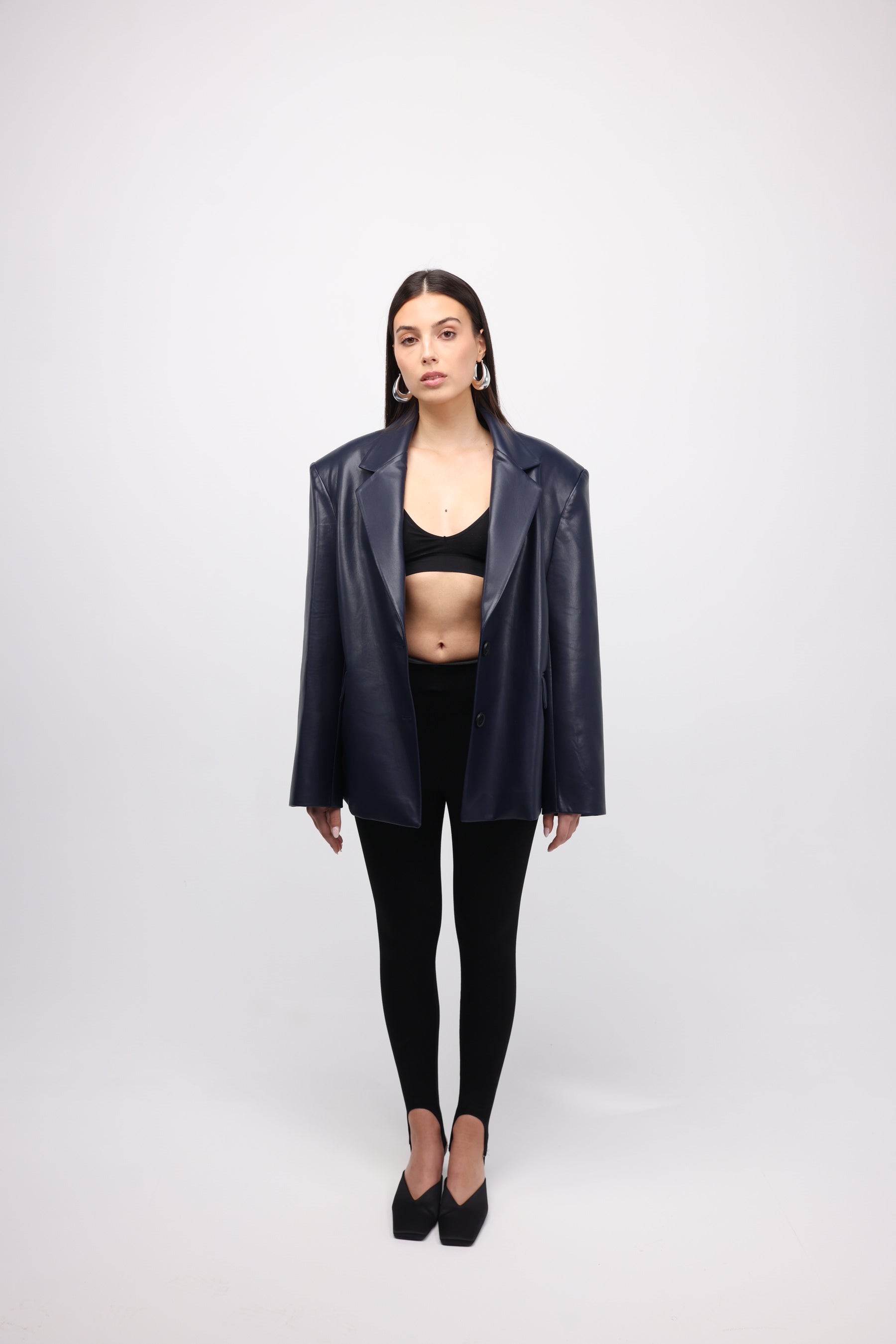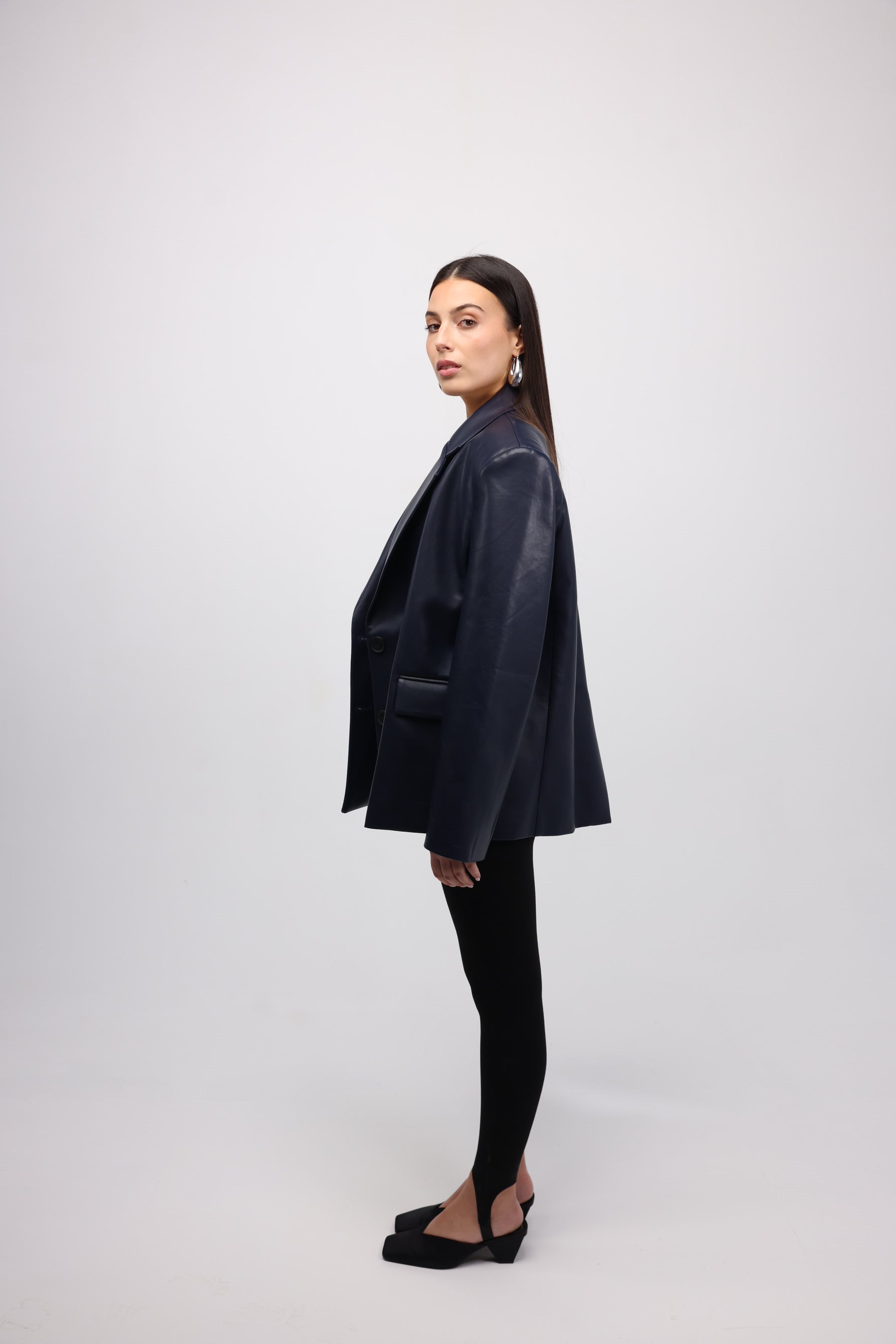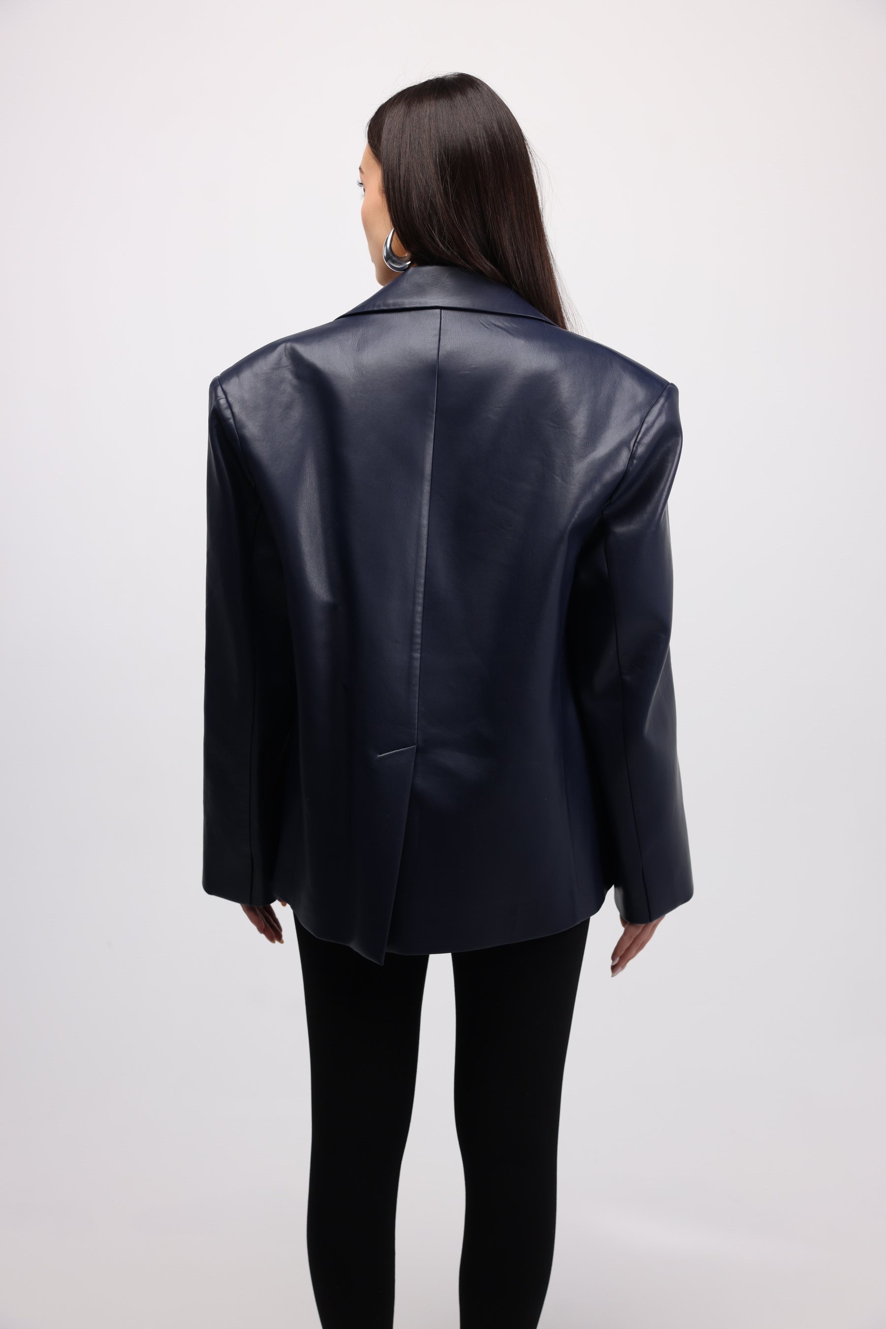 Oversized navy faux leather blazer with structured shoulders and a sleek finish. A bold, versatile staple for effortless layering.