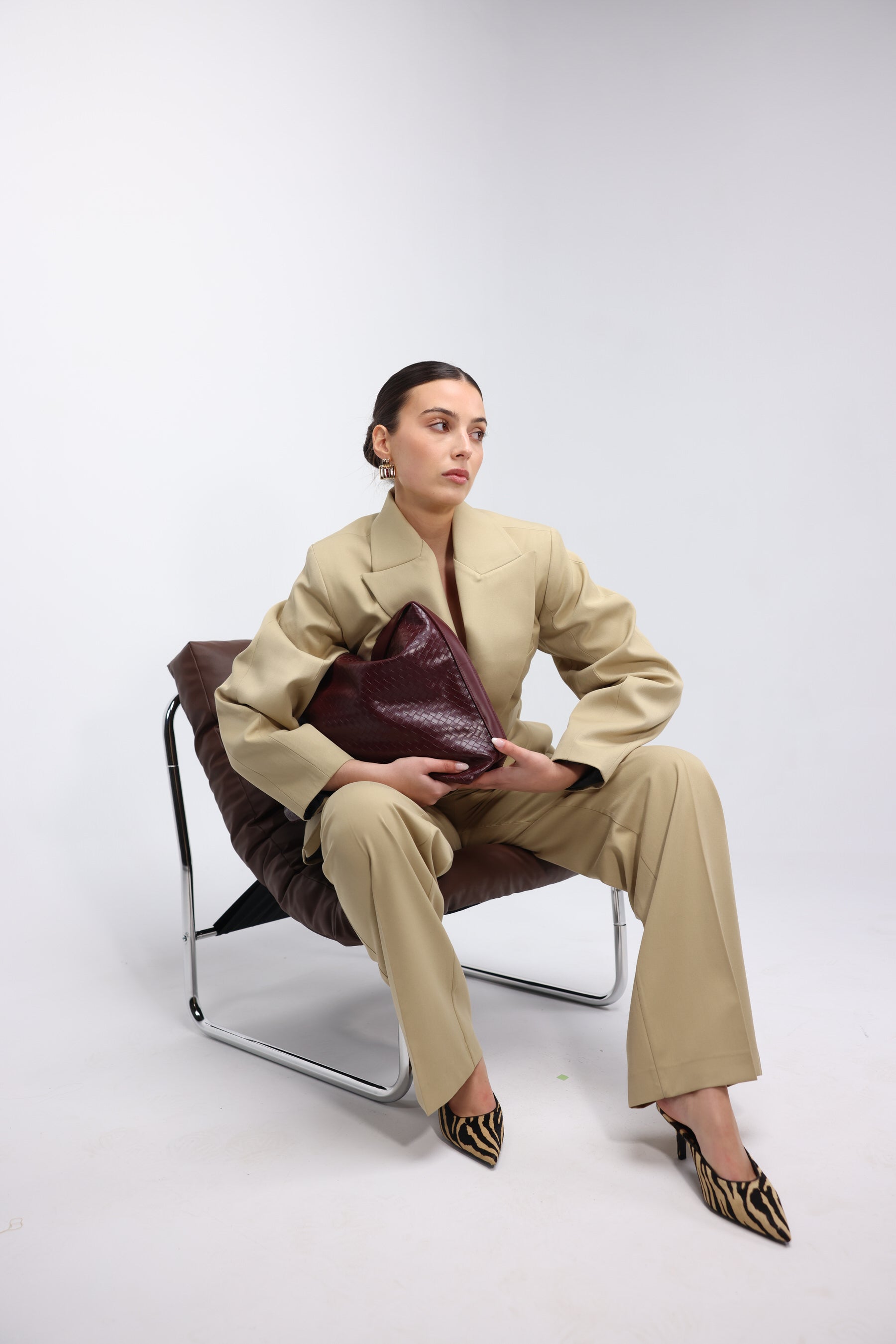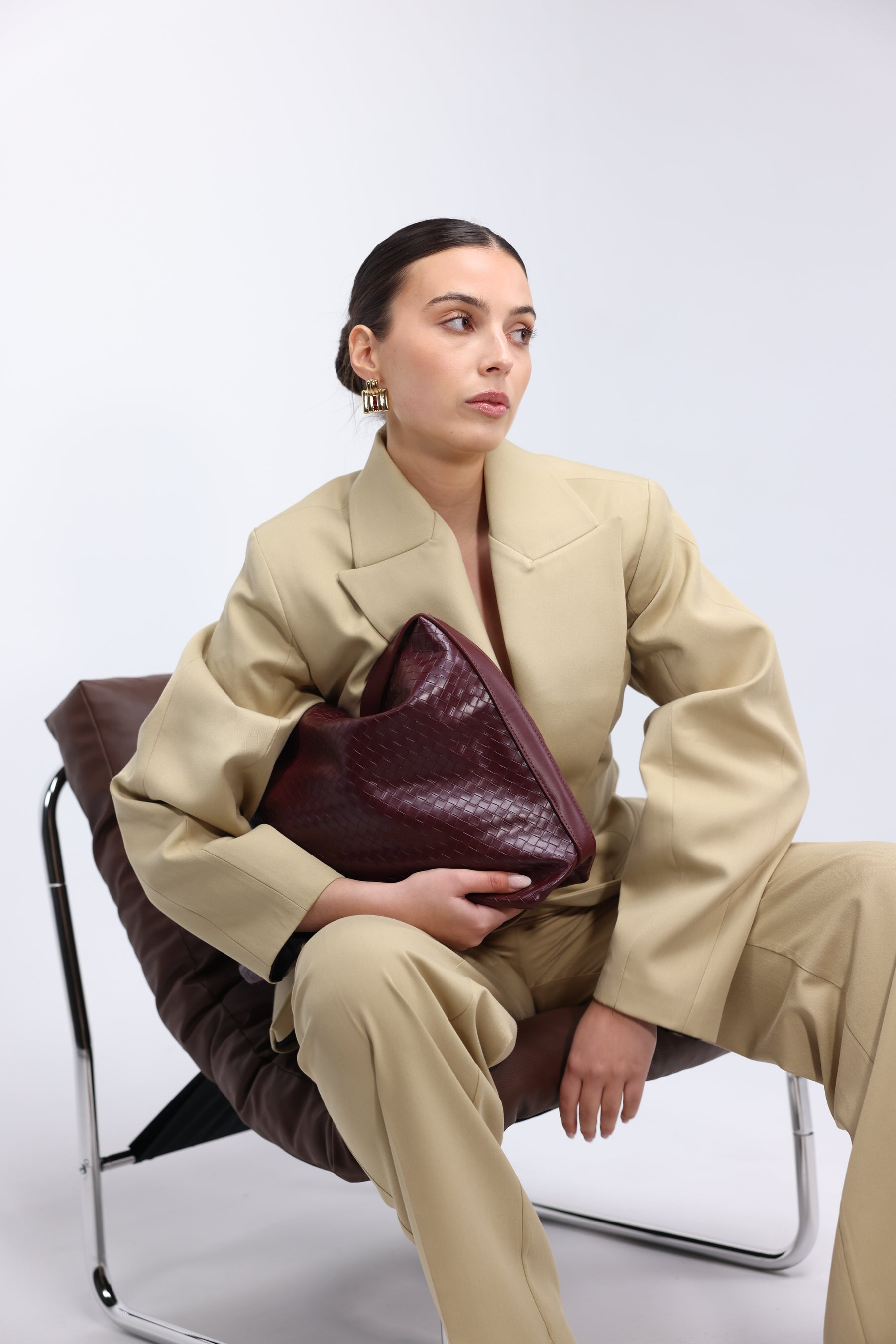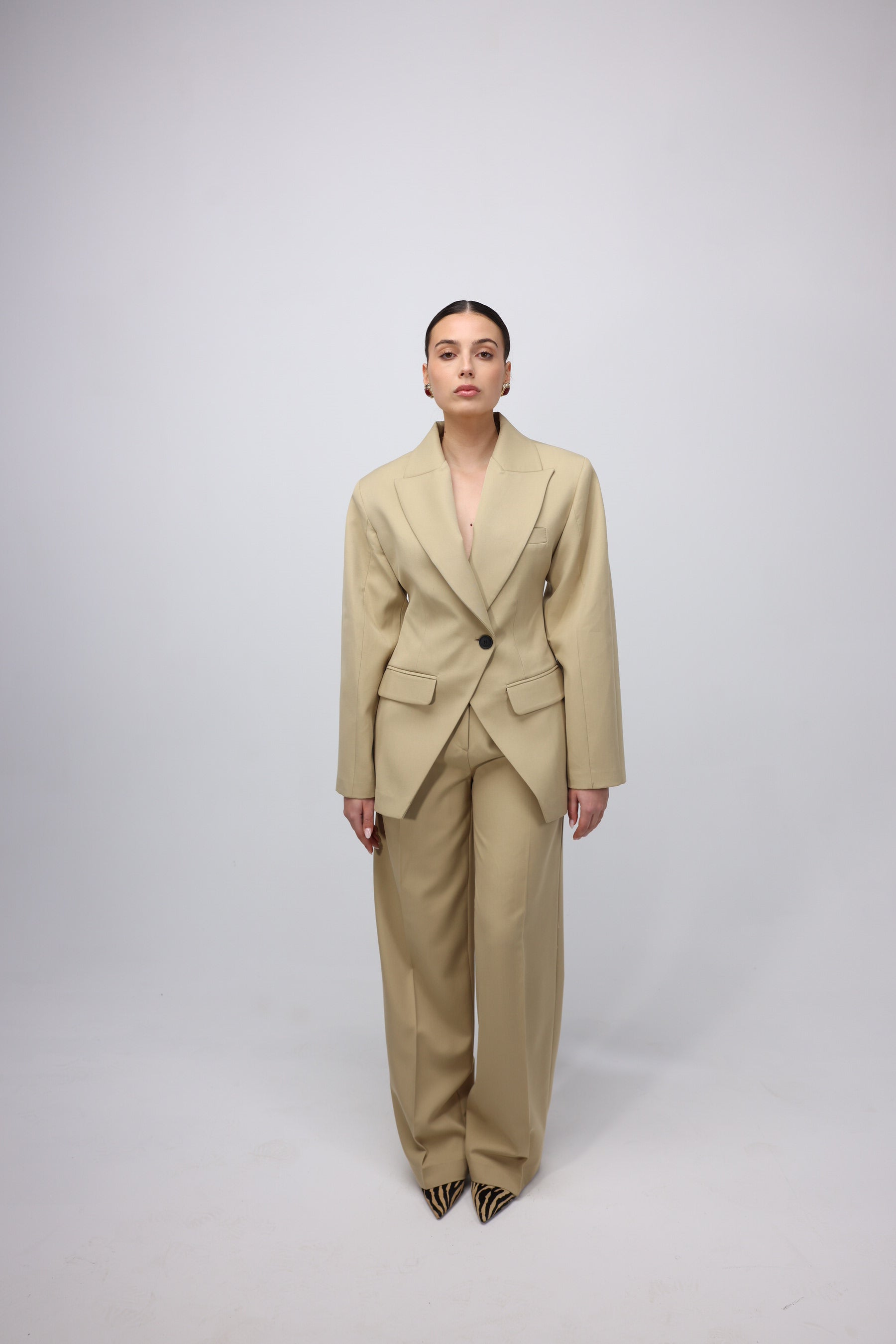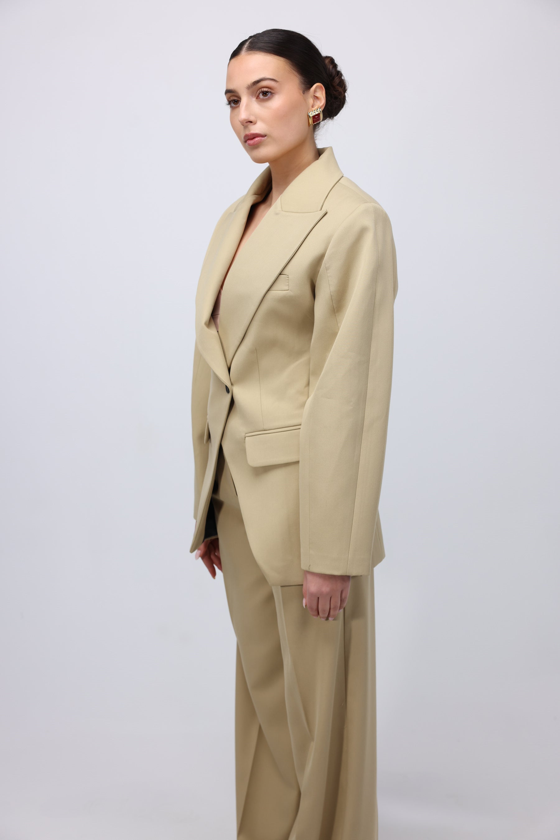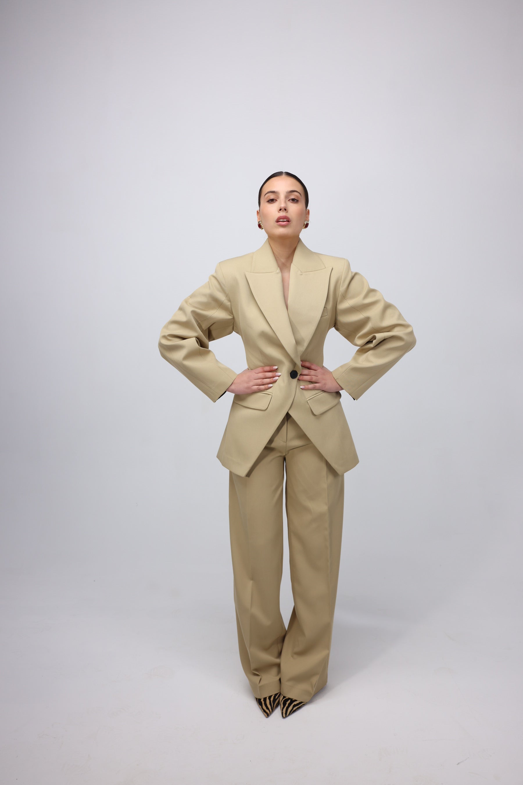 Beige oversized pantsuit featuring a structured blazer with wide lapels, a single-button closure, and flap pockets. Paired with wide-leg trousers for a sleek, modern silhouette.