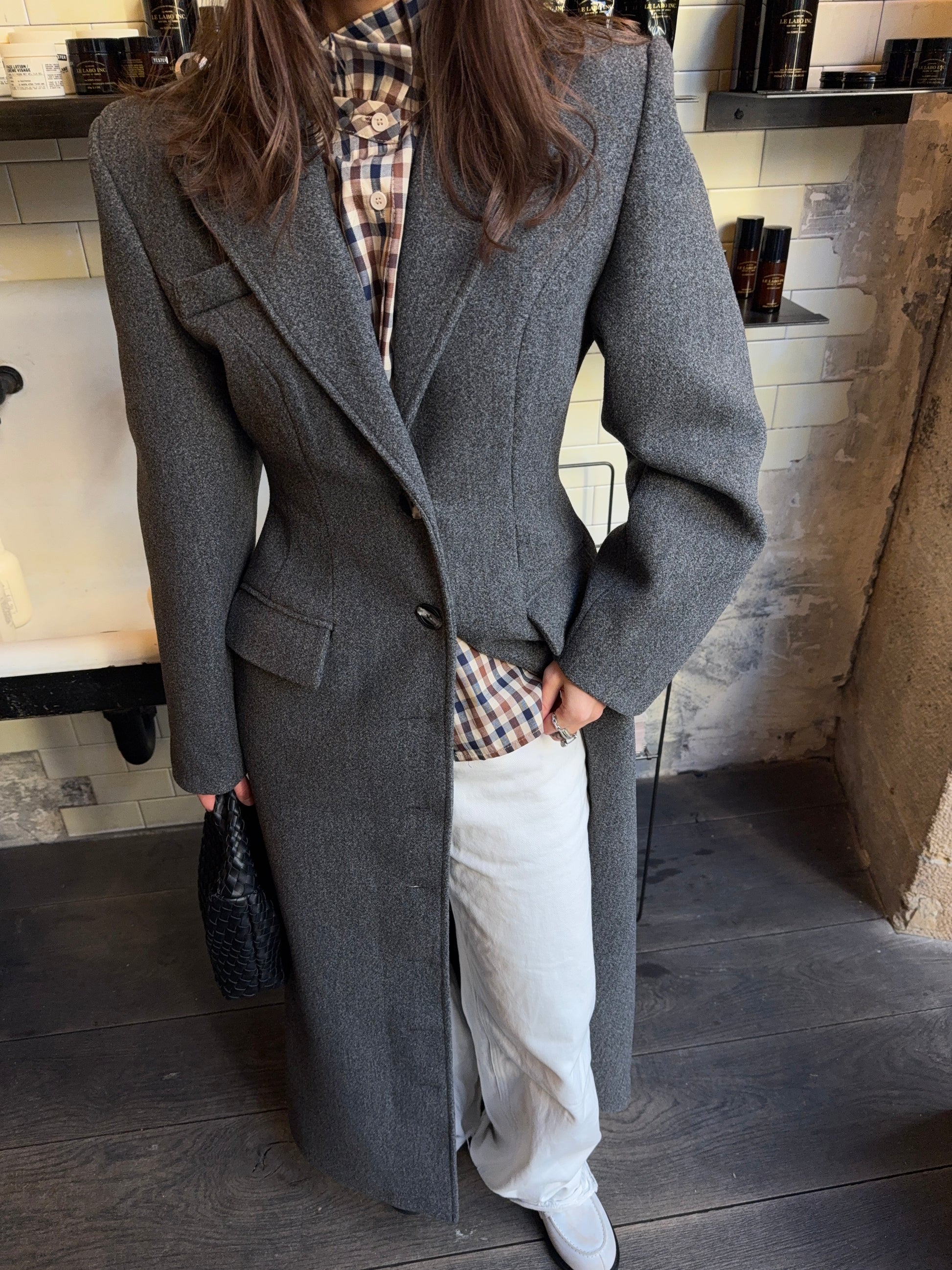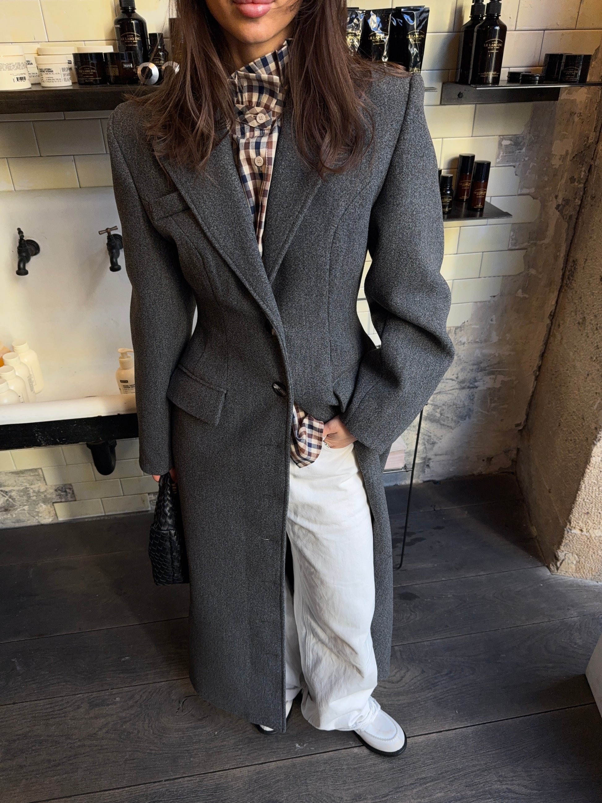A refined longline coat designed with a sculpted, feminine silhouette. The structured shoulders and precise tailoring create an elegant balance between strength and sophistication, making this piece perfect for both everyday wear and elevated occasions. Finished with discreet flap pockets and a full-length cut for a polished, modern look.
