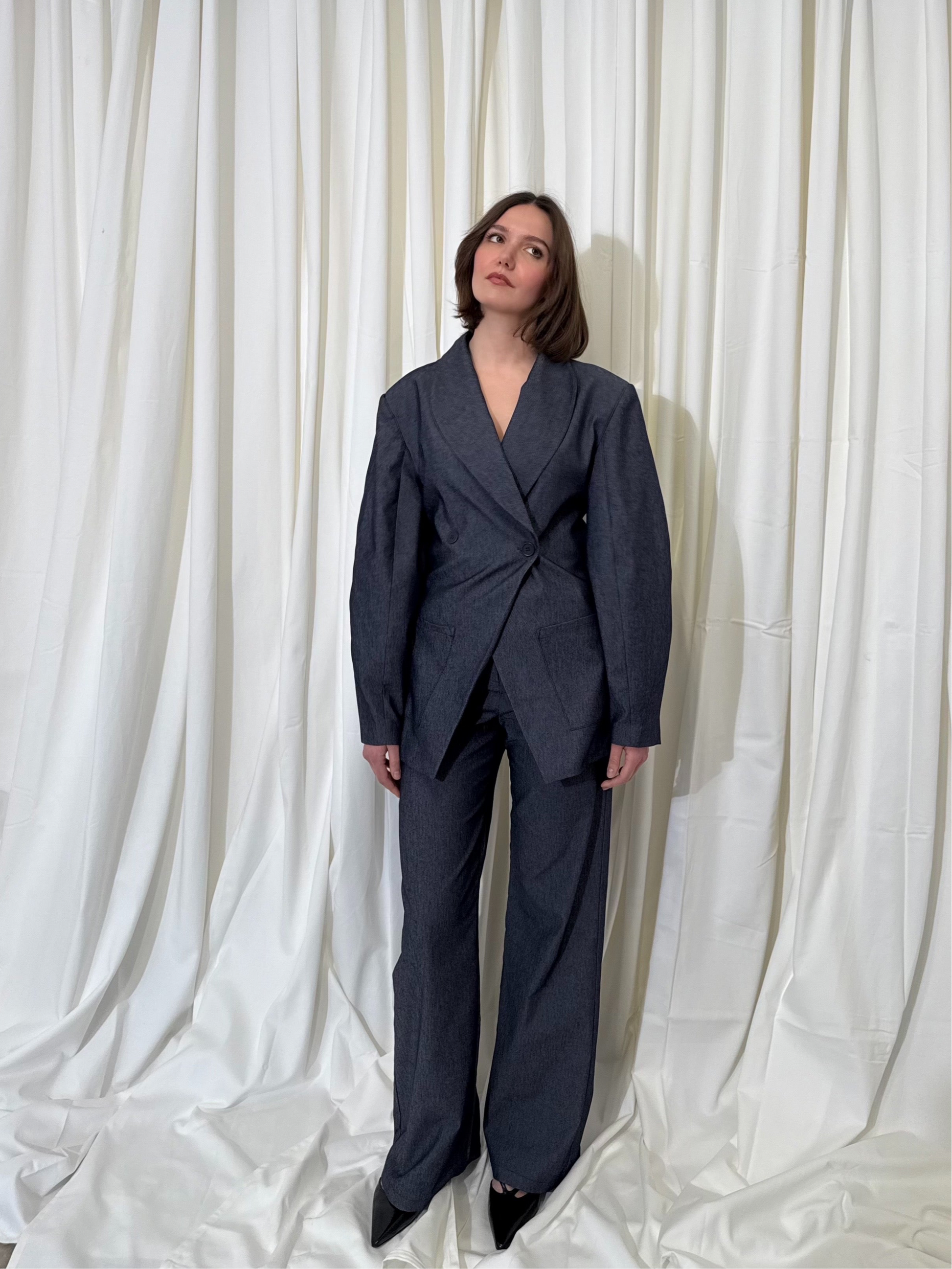 Step into effortless sophistication with the TWILL SET NAVY. This deep navy ensemble features a relaxed yet structured silhouette. The double-breasted blazer is designed with sculpted shoulders, wide lapels, and oversized patch pockets, giving it a modern twist on classic tailoring. The matching straight-leg trousers complete the look with timeless elegance.