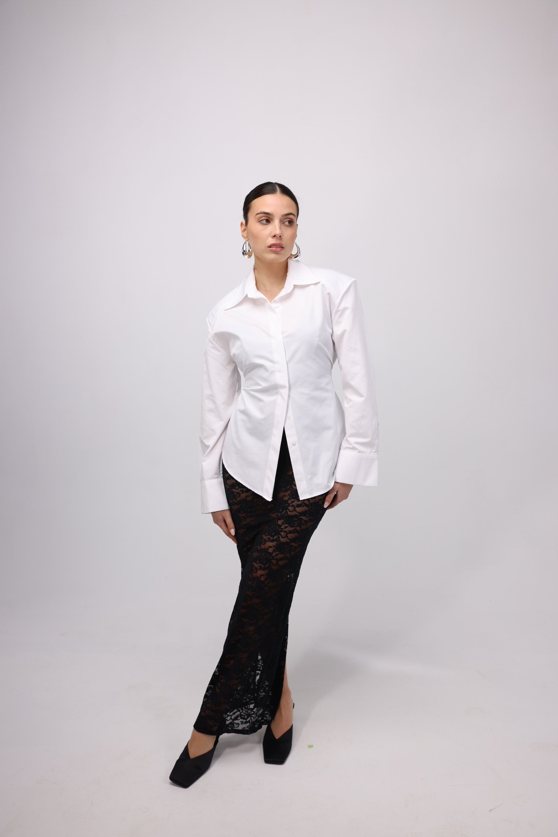 White tailored button-up shirt with an adjustable tie-back detail, structured collar, and elongated cuffs. A versatile piece blending classic tailoring with modern refinement.